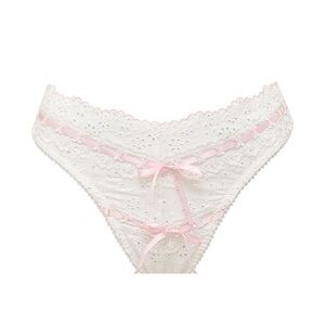 Delicate eyelet lace and beautiful blue ribbons make a perfect pair in this vintage-inspired thong.