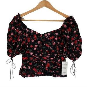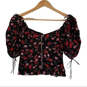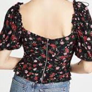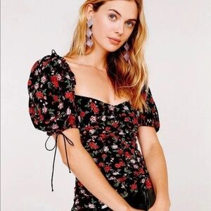 NWT For love & Lemons Tainted Button Front Top Black with Roses Size XS . "On the shoulder. Off the shoulder. She's versatile. The Tainted Button Front Top features a rose printed top with puff sleeves, center front buttons, a fitted shirred silhouette, a center back zipper and a mid rise length."