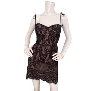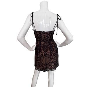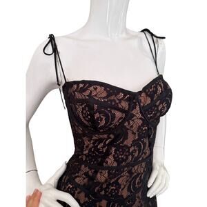 Black lace mini dress with nude lining, self tie spaghetti straps, structured bodice, raw lace hem, hidden back zipper.