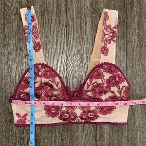 A knockout for a knockout. The Temecula Top by For Love & Lemons comes in nude mesh and features red floral embroidery throughout, back tie closure full nude lining, and scalloped hem at best.