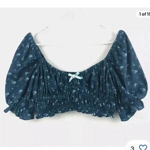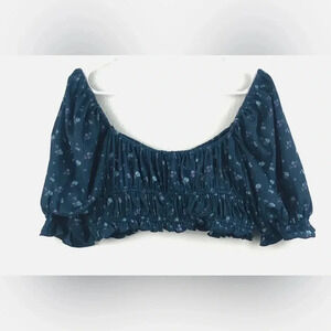 For Love & Lemons Top Womens Xs Navy Blue Floral Pointelle Lola Cropped Ruffle