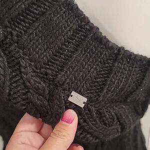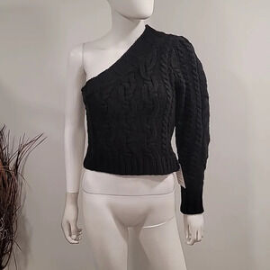 Long sleeve cable knit and rib knit wool-blend single-shoulder sweater in black. Rib knit crewneck collar, cuffs, and hem. Fit runs small, we advise to take half a size larger. Supplier color: Black