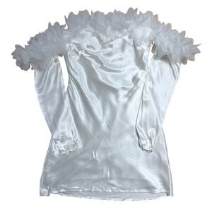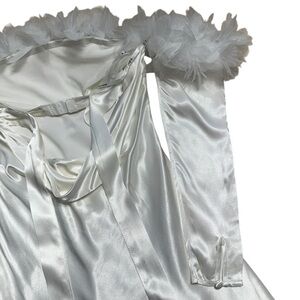 For Love & Lemons •Detachable Arm Sleeves •Satin •Tie Back •Ruffled Petal Bust Details •Mini •Bridal •Bachelorette •Honeymoon •Adjustable Bra Hooks •Cowl Backline •Reception Dress •Graduation •Cocktail •Party