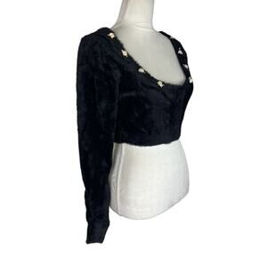 * Features: Cropped fit, fuzzy knit texture, floral appliqués, button front