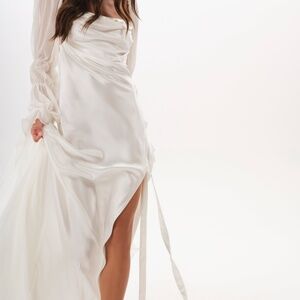 This vintage-inspired wedding gown features a delicately draped cowl at front and back bodice with cascading chiffon poet sleeves and tulle shoulder pads. The skirt features a thigh-high slit with a draped sash along the side and a long dreamy train. Button and zipper closures at back.