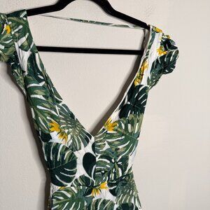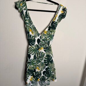 Keywords: Urban Outfitters, dress, mini dress, tropical print, palm leaf, cutout dress, tie back, summer dress, vacation dress, party dress, boho dress, festival dress, green dress, white dress
