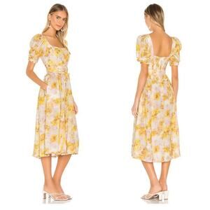 For Love & Lemons | Womens Zinna Midi Dress Lemonade Yellow Floral Smocked Small