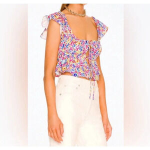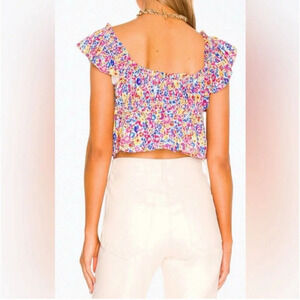 This For Love & Lemons Sasha crop top features a beautiful floral print and ruffle accents. The top is made from a blend of 50% Ecovero and 50% Viscose, making it a sustainable and comfortable choice for any season. The top is designed with a regular fit and cutout detailing that adds a touch of style and sophistication. It is perfect for pairing with high-waisted jeans or skirts for a trendy and chic look.