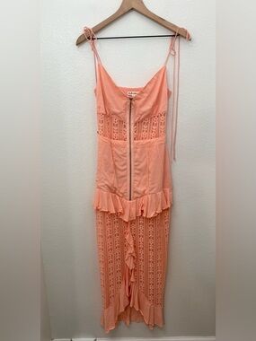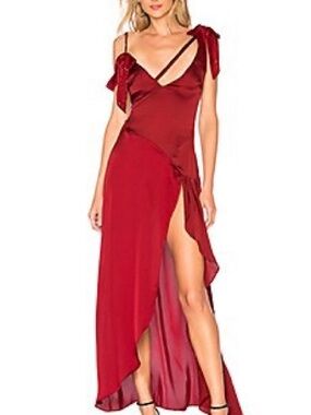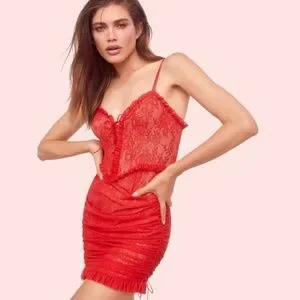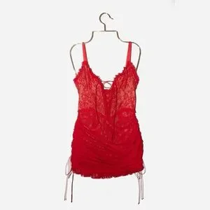 Red lace dress with adjustable high-low hem and a built-in panty. You can wear it mini or knee length.