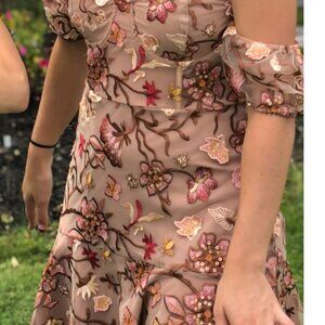For Love & Lemons Botanic Strapless/Off Shoulder Mini Dress in a size Medium. This floral nude / beige dress features a beautiful embroidered design, sequined and appliqué detail. It has an underwire bust, elasticized arm openings. These is a hidden back zipper and the dress is fully lined. This dress fits like a dream. It’s in good condition, I only wore it once.