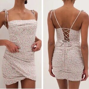 Make any occasion a little more fun with this feminine selection. Complete with baby butterfly print, cowl neckline, tie straps, built-in bustier, and unique wrap-front skirt.