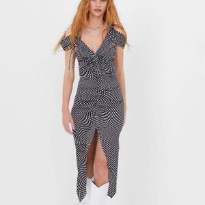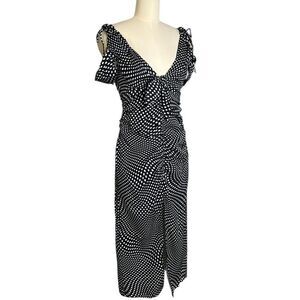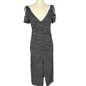 Black and White polka dot midi dress with low tie front neckline. Draped cowl sleeves and gathered shoulder ties. Center-front slit on skirt, criss cross detail on the back.