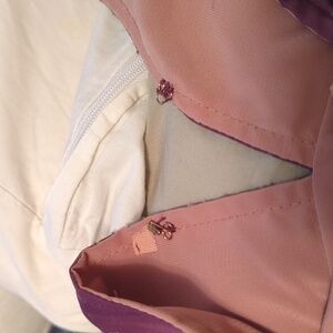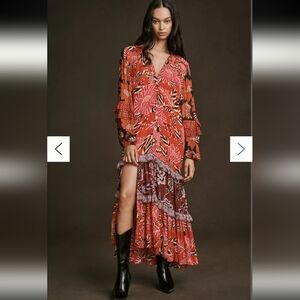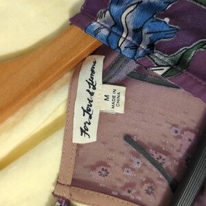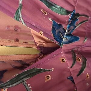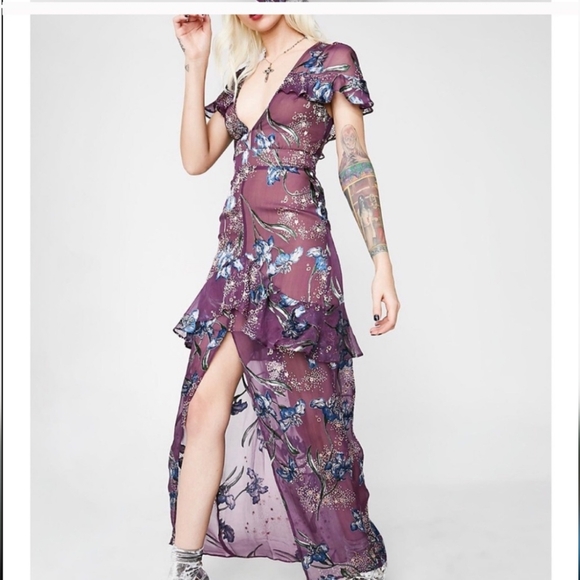 Good condition for Love and Lemons purple flowered maxi. Front slit, lined, deep v neckline with beautiful sheer fabric over shoulders in back. Tiered dress. Deep v in front has a small clasp to keep it together. Worn once to a wedding. I added a bit of boob tape to inside of front clasp to hold threads - see photos. Chest 14" across laid flat. 58" shoulder to hem.