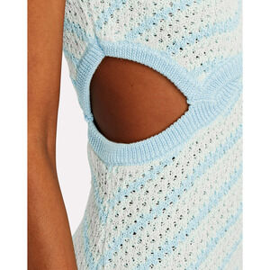For Love and Lemons Corina Cut Out Mini Dress in Blue. Features a fitted mini length silhouette, round neck styling, open knit fabrication, chevron color blocking, cut outs at waist, ribbed hem, pullover styling. 100% recycled polyester. New without tags with markings at brand label to prevent retail returns and a small hole at back.