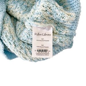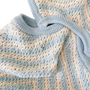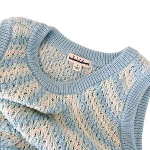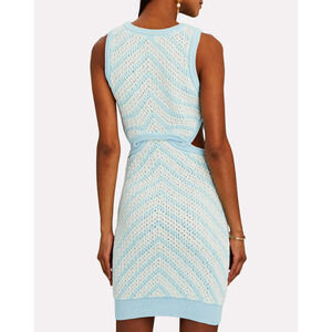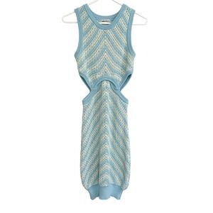 For Love and Lemons Corina Cut Out Mini Dress in Blue. Features a fitted mini length silhouette, round neck styling, open knit fabrication, chevron color blocking, cut outs at waist, ribbed hem, pullover styling. 100% recycled polyester. New without tags with markings at brand label to prevent retail returns and a small hole at back.