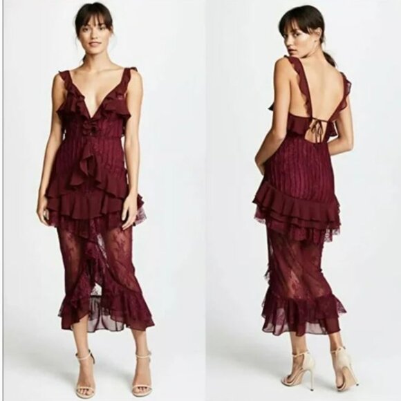 For Love and Lemons Daphne Lace Midi Ruffle Dress Burgundy Sz XS