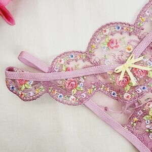 For Love & Lemons, FL&L, Daphne, Thong Panty, Purple Lace, Floral Embroidery, Metallic, Tulle, Scallop, Rhinestone Bow, Strappy, Low Rise, High-Leg Cut, Designer Lingerie, Romantic, Sultry, Intimates, Underwear, Vintage Look.
