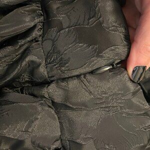 This dress is gorgeous with tie shoulder straps, hook and eye closure and zipper in back. Corset style fit and flare waist. Cherry blossom jacquard fabric Layered Angled waist seam Full gathered skirt Criss-cross back straps Hook & eye closure Center-back invisible zipper