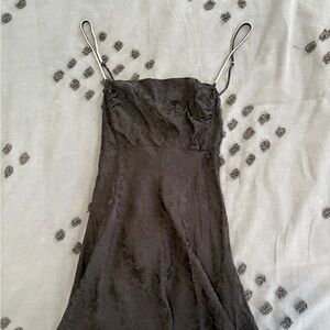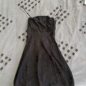 Black silk floral mini slip dress with rhinestone straps and tie back