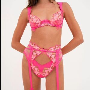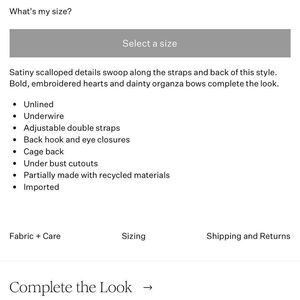 Satiny scalloped details swoop along the straps and back of this style. Bold, embroidered hearts and dainty organza bows complete the look.