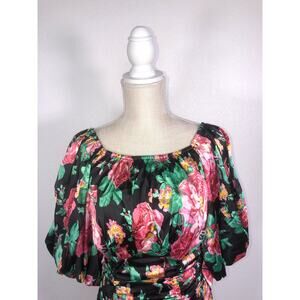 This gorgeous dress is charming and stylish. It features a bold and beautiful floral print with a black background that makes the colors pop. The gathered neck is accented by oversized puff sleeves that have hidden elastic to keep the puffed effect. It is a bodycon style, so it flatters and hugs. The skirt has a shirred detail that adds to the cut. It is fully lined and has a hidden back zipper with hook-and-eye closure. New with tags.