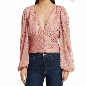 For Love & Lemons La Vielette Cropped blouse in size small. Drama-filled corset blouse with sparkles throughout. Plunging v- neckline, long puff sleeves, lined. Measurements are approximates only