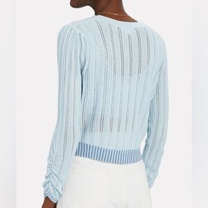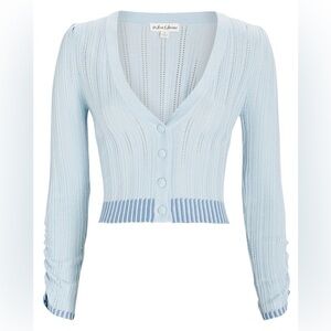 Brand new with tags For Love and Lemons Rhea Pointelle Cardigan Sweater in light blue. Plus size 2X. Button front. Ribbed hem. V-neck. Ruched sleeves. Lightweight and breathable. Classic, nautical, preppy, coquette, feminine, victorian aesthetics. NWT- writing on interior care tag.