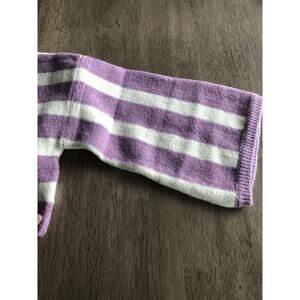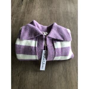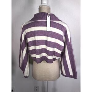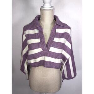 This cozy cropped sweater is a seasonal transition piece. It is a cropped style that features a retro inspires strip design. The classic pastel purple contrast nicely with the white. The fit is a boxy cut, with a deep-V neckline and polo style collar. The sweater is a medium weight rib knit that has some stretch and a soft feel. The sleeves are a 3/4 fit that is meant to be wide. New with tags.