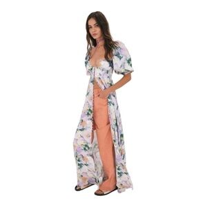Smokey floral maxi length top with smocked elbow-length sleeves and functional dorset buttons along center-front, stopping at knee length. Functional lace-up on back bodice panel. Partially lined.