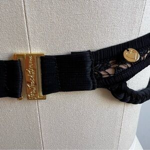 Triangle silhouette. Halterneck with an adjustable tie neckline. Braided detail (with stretch). Gold tone hardware. Back band with a slot hook closure. Lined, no sheerness. Lightweight, mixed media fabric, with stretch only where braided. Hand wash cold (drip dry/no dryer or iron).