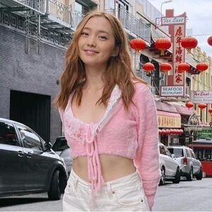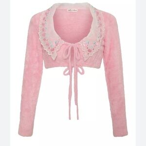 For Love and Lemons Sweet Cherry Cardigan Pink cropped and fuzzy. The funnest spring cardigan to add to your closet