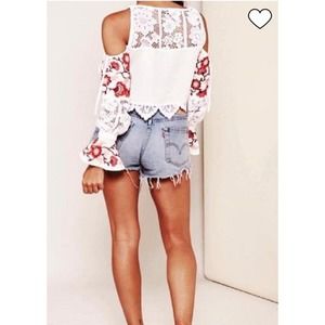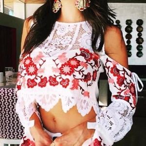 This top is GORGEOUS. So many beautiful details: lots of lace, embroidered flowers, and bell cuffs. Super sexy, feminine take on prairie.