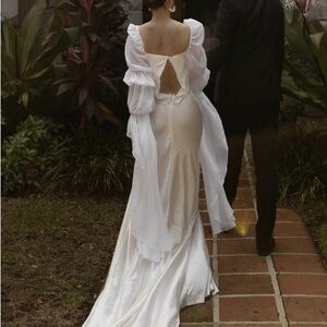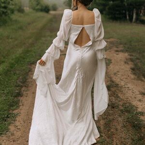This elegant white dress features stylish puff sleeves and a chic side slit, perfect for any special occasion.