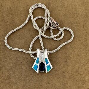 For your a Beautiful Deep Blue 7x5MM Oval Shape Sapphire & Australian Opal Inlay 925 Solid Sterling Silver Pendant Surrounded by White Sapphires. Comes with a 18 inch 2MM Diamond Cut Italian 925 Silver Necklace New w/tags (Sapphire is Septembers Birth Stone Opal is for October)