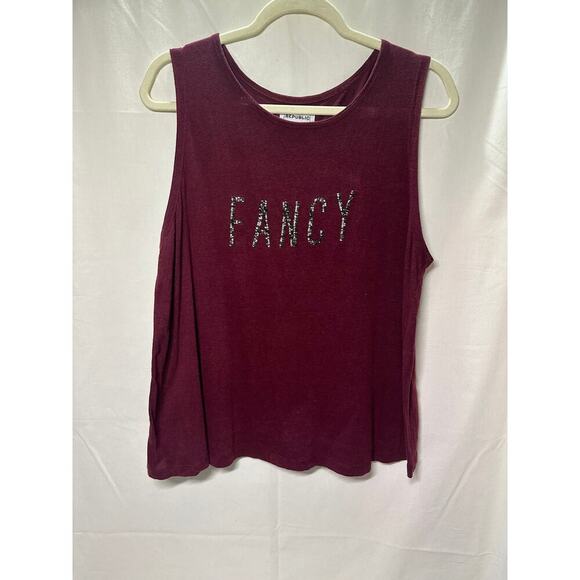 Add a touch of sparkle to your wardrobe with this stylish tank top from For The Republic. Featuring the word "FANCY" in eye-catching black and silver beaded embellishments, this tank is perfect for casual outings or layering under a jacket. Made from a soft and breathable cotton blend in a rich burgundy color, it offers comfort and style. Its relaxed fit, wide straps, and scoop neckline make it a versatile piece for any season.