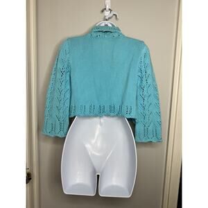 For The Republic Women’s Small Blue Open Knit Cardigan 100% Cotton Ruffle Shrug