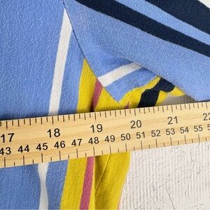 Vibrant striped short sleeve hoodie with a drawstring. Features blue, yellow, and black stripes.
