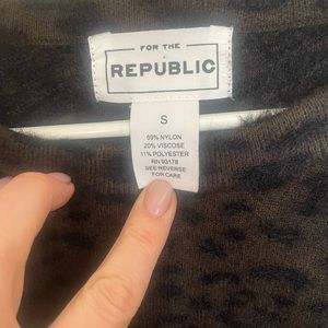This is a For the Republic sweater in an olive green animal print. Posted a picture close enough to see the print. Pit to pit measures approx 17.5 inches and the length from shoulder to bottom hem is approx 23.5 inches. Excellent condition.
