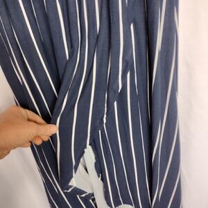 blue and white striped, smocked bodice, off the shoulder, high low dress. pit to pit 15" length of back 52" length in front 32"