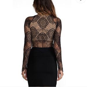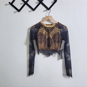 An unique crop made from sheer baroque lace with a smooth nude lining and scalloped edges. Sheer long sleeves.