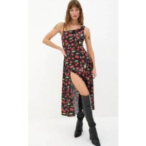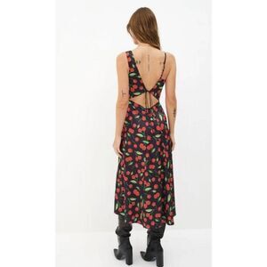 For Love & Lemons Xena Cherry Print Asymetrical Slit Midi Dress