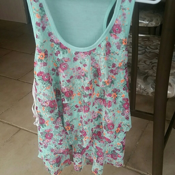 Never worn. Mint (seafoam green) shirt with foral design on the front. the front of the shirt is ruffled.