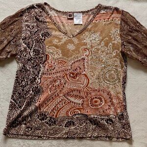 really cool & funkyy2k orange and brownPaisleyPatterned sheer sleeved top, has wideruffly flared sleeves, boho hippie fairyvibes