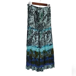Step out in a beautiful, flowing vintage Forbidden maxi skirt! This stunning piece features a unique, multi-tiered design with a blue floral and paisley print on a cream/white background, accented by teal blue crochet and lace detailing.