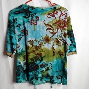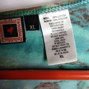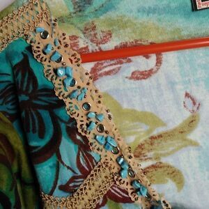 Cotton shirt, rolled edge hem. V neck embellished with faux leather and turquoise beads. Chest 21, length 24". Z