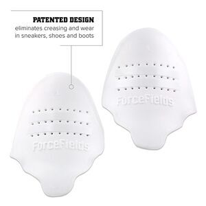 The ForceField Shoe Crease Preventer is a patented sneaker protector designed to keep your shoes looking fresh by preventing unsightly creases. Sized medium, these protectors fit comfortably in the toe box, ensuring your sneakers retain their shape over time. Crafted from soft foam, they mold to the shoe while two adhesive strips securely hold them in place during movement. Perfect for sneaker enthusiasts or anyone looking to preserve the appearance of their footwear, these crease preventers are a must-have accessory to avoid wear and tear. Patent #8,490,302.