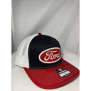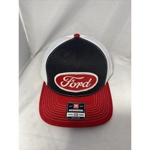 Hat features Red and White embroidered oval Ford logo patch on a Black / White / Red mesh back premium Richardson 112 Snapback Trucker hat