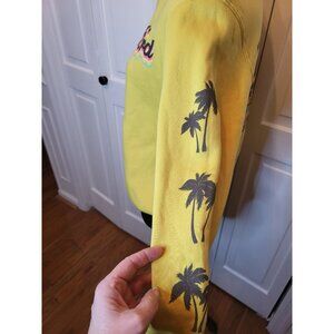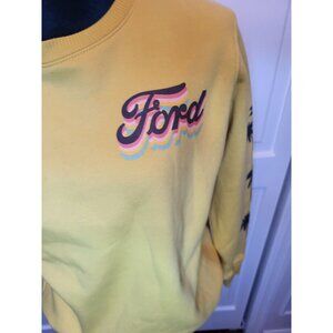 Yellow Sweatshirt by Ford features a classic Mustang an a awesome Miami inspired neon print. Back of shirt has a neon, sunset graphic with palm trees. Sleeves also have palm trees. Shirt has a tiny spot on the front (See 5th picture).