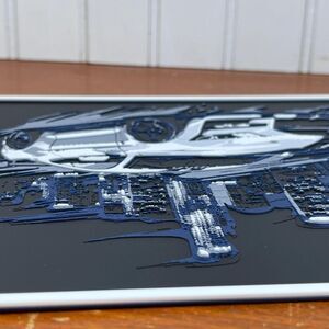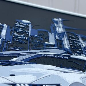 Cool 3D printed wall art featuring a Ford Mustang Cobra with a city skyline in the background. Mustang is depicted in colors of Blue, white, gray & black. The texture and detail is bound to be a conversation starter.