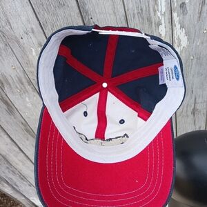 It's a Ford logo American flag style of baseball cap. It does have light signs of wear. There's some discoloration inside and a small stain on the top. It's one size fits most